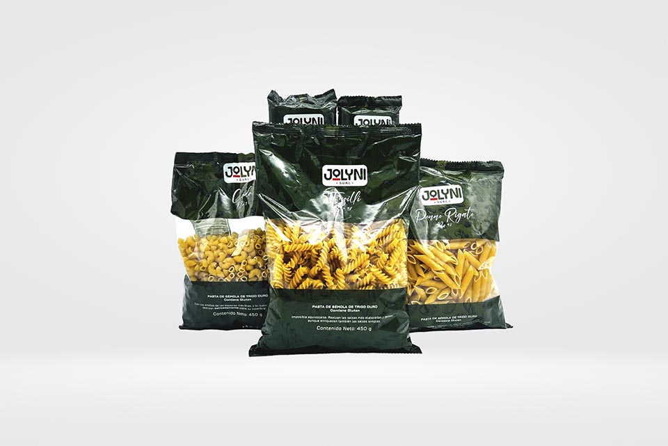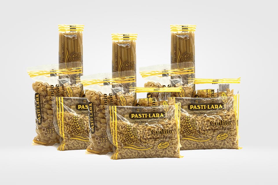 Pastas cortas y largas (Codo, Penne Rigate, Tubetti Rigate, Farfalle, Fusilli, Spaguetti), calidad Moderna, 100% sémola de trigo durum.